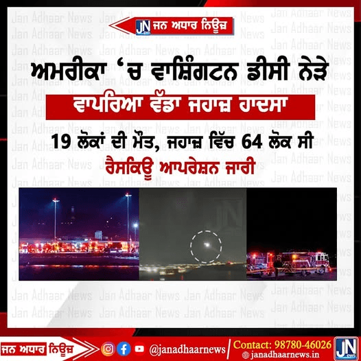 ਅਮਰੀਕਾ ‘ਚ ਵਾਸ਼ਿੰਗਟਨ ਡੀਸੀ ਨੇੜੇ ਵਾਪਰਿਆ ਵੱਡਾ ਜਹਾਜ ਹਾਦਸਾ, ਯਾਤਰੀ ਜਹਾਜ਼ ਤੇ ਹੈਲੀਕਾਪਟਰ ਦੀ ਹੋਈ ਆਪਸ ਵਿੱਚ ਟੱਕਰ। 19 ਲੋਕਾਂ ਦੀ ਮੌਤ, ਜਹਾਜ਼ ਵਿੱਚ 64 ਲੋਕ ਸੀ ਸਵਾਰ। ਰੈਸਕਿਊ ਆਪਰੇਸ਼ਨ ਜਾਰੀ।