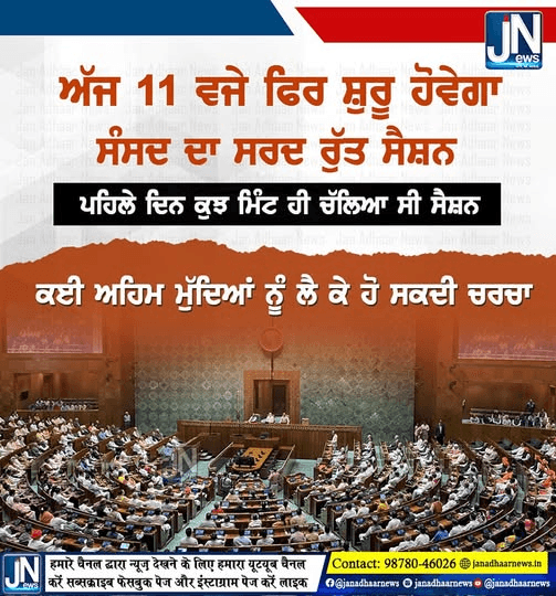 ਅੱਜ 11 ਵਜੇ ਫਿਰ ਸ਼ੁਰੂ ਹੋਵੇਗਾ ਸੰਸਦ ਦਾ ਸਰਦ ਰੁੱਤ ਸੈਸ਼ਨ ….ਪਹਿਲੇ ਦਿਨ ਕੁਝ ਮਿੰਟ ਹੀ ਚੱਲਿਆ ਸੀ ਸੈਸ਼ਨ…ਕਈ ਅਹਿਮ ਮੁੱਦਿਆਂ ਨੂੰ ਲੈ ਕੇ ਹੋ ਸਕਦੀ ਚਰਚਾ।