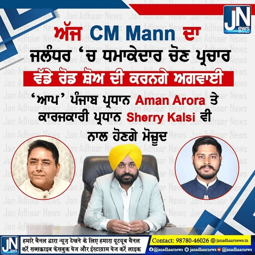 ਅੱਜ CM Mann ਕਰਨਗੇ ਜਲੰਧਰ ‘ਚ ਧਮਾਕੇਦਾਰ ਚੋਣ ਪ੍ਰਚਾਰ ਵੱਡੇ ਰੋਡ ਸ਼ੋਅ ਦੀ ਕਰਨਗੇ ਅਗਵਾਈ | ਆਪ ਪ੍ਰਧਾਨ Aman Arora , ਕਾਰਜਕਾਰਨੀ ਪ੍ਰਧਾਨ Sherry Kalsi, ਕੈਬਨਿਟ ਮੰਤਰੀ ਮਹਿੰਦਰ ਭਗਤ ਵੀ ਨਾਲ ਹੋਣਗੇ ਮੌਜੂਦ।