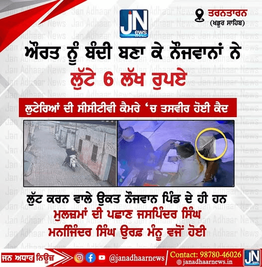 ਔਰਤ ਨੂੰ ਬੰਦੀ ਬਣਾ ਕੇ ਨੌਜਵਾਨਾਂ ਨੇ ਲੁੱਟੇ 6 ਲੱਖ ਰੁਪਏ ,ਲੁਟੇਰਿਆਂ ਦੀ ਸੀਸੀਟੀਵੀ ਕੈਮਰੇ ‘ਚ ਤਸਵੀਰ ਹੋਈ ਕੈਦ ਲੁੱਟ ਕਰਨ ਵਾਲੇ ਉਕਤ ਨੌਜਵਾਨ ਪਿੰਡ ਦੇ ਹੀ ਹਨ ਮੁਲਜ਼ਮਾਂ ਦੀ ਪਛਾਣ ਜਸਪਿੰਦਰ ਸਿੰਘ ,ਮਨਜਿੰਦਰ ਸਿੰਘ ਉਰਫ਼ ਮੰਨੂ ਵਜੋਂ ਹੋਈ।