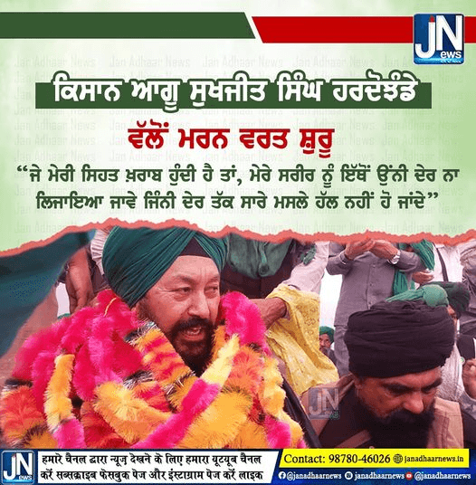 ਕਿਸਾਨ ਆਗੂ ਸੁਖਜੀਤ ਸਿੰਘ ਹਰਦੋਝੰਡੇ’ਵੱਲੋਂ ਮਰਨ ਵਰਤ ਸ਼ੁਰੂ “ਜੇ ਮੇਰੀ ਸਿਹਤ ਖ਼ਰਾਬ ਹੁੰਦੀ ਹੈ ਤਾਂ, ਮੇਰੇ ਸਰੀਰ ਨੂੰ ਇੱਥੋਂ ਉਂਨੀ ਦੇਰ ਨਾ ਲਿਜਾਇਆ ਜਾਵੇ ਜਿੰਨੀ ਦੇਰ ਤੱਕ ਸਾਰੇ ਮਸਲੇ ਹੱਲ ਨਹੀਂ ਹੋ ਜਾਂਦੇ”