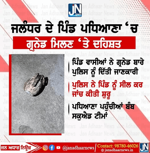 ਜਲੰਧਰ ਦੇ ਪਿੰਡ ਪਧਿਆਣਾ ਵਿਖੇ ‘ਗ੍ਰਨੇਡ ਮਿਲਣ ‘ਤੇ ਦਹਿਸ਼ਤ ਪਿੰਡ ਵਾਸੀਆਂ ਨੇ ਗ੍ਰਨੇਡ ਬਾਰੇ ਪੁਲਿਸ ਨੂੰ ਦਿੱਤੀ ਜਾਣਕਾਰੀ ਪੁਲਿਸ ਨੇ ਪਿੰਡ ਨੂੰ ਸੀਲ ਕਰ ਜਾਂਚ ਕੀਤੀ ਸ਼ੁਰੂ।