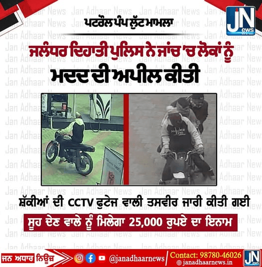 ਜਲੰਧਰ ਦਿਹਾਤੀ ਪੁਲਿਸ ਨੇ ਜਾਂਚ ‘ਚ ਲੋਕਾਂ ਨੂੰ ਮਦਦ ਦੀ ਅਪੀਲ ਕੀਤੀ | ਸ਼ੱਕੀਆਂ ਦੀ CCTV ਫੁਟੇਜ ਵਾਲੀ ਤਸਵੀਰ ਜਾਰੀ ਕੀਤੀ ਗਈ | ਸੂਹ ਦੇਣ ਵਾਲੇ ਨੂੰ ਮਿਲੇਗਾ 25,000 ਰੁਪਏ ਦਾ ਇਨਾਮ।