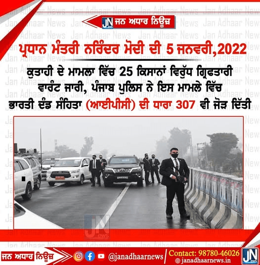 ਪ੍ਰਧਾਨ ਮੰਤਰੀ ਨਰਿੰਦਰ ਮੋਦੀ ਦੀ 5 ਜਨਵਰੀ, 2022 ਨੂੰ ਪੰਜਾਬ ਫੇਰੀ ਦੌਰਾਨ ਸੁਰੱਖਿਆ ਵਿੱਚ ਕੁਤਾਹੀ ਦੇ ਮਾਮਲੇ ਵਿੱਚ 25 ਕਿਸਾਨਾਂ ਵਿਰੁੱਧ ਗ੍ਰਿਫ਼ਤਾਰੀ ਵਾਰੰਟ ਜਾਰੀ,ਪੰਜਾਬ ਪੁਲਿਸ ਨੇ ਇਸ ਮਾਮਲੇ ਵਿੱਚ ਭਾਰਤੀ ਦੰਡ ਸੰਹਿਤਾ (ਆਈਪੀਸੀ) ਦੀ ਧਾਰਾ 307 ਵੀ ਜੋੜ ਦਿੱਤੀ।