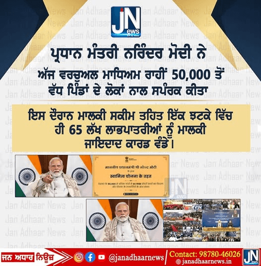 ਪ੍ਰਧਾਨ ਮੰਤਰੀ ਨਰਿੰਦਰ ਮੋਦੀ ਨੇ ਅੱਜ ਵਰਚੁਅਲ ਮਾਧਿਅਮ ਰਾਹੀਂ 50,000 ਤੋਂ ਵੱਧ ਪਿੰਡਾਂ ਦੇ ਲੋਕਾਂ ਨਾਲ ਸੰਪਰਕ ਕੀਤਾ। ਇਸ ਦੌਰਾਨ ਮਾਲਕੀ ਸਕੀਮ ਤਹਿਤ ਇਕ ਝਟਕੇ ਵਿੱਚ ਹੀ 65 ਲੱਖ ਲਾਭਪਾਤਰੀਆਂ ਨੂੰ ਮਾਲਕੀ ਜਾਇਦਾਦ ਕਾਰਡ ਵੰਡੇ।