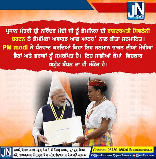 ਪ੍ਰਧਾਨ ਮੰਤਰੀ ਸ਼੍ਰੀ ਨਰਿੰਦਰ ਮੋਦੀ ਜੀ ਨੂੰ ਡੋਮਿਨਿਕਾ ਦੀ ਰਾਸ਼ਟਰਪਤੀ ਸਿਲਵੇਨੀ ਬਰਟਨ ਨੇ ਡੋਮਿਨਿਕਾ ਅਵਾਰਡ ਆਫ਼ ਆਨਰ’ ਨਾਲ ਕੀਤਾ ਸਨਮਾਨਿਤ। PM Modi ਨੇ ਧੰਨਵਾਦ ਕਰਦਿਆਂ ਕਿਹਾ ਇਹ ਸਨਮਾਨ ਭਾਰਤ ਦੀਆਂ ਮੇਰੀਆਂ ਭੈਣਾਂ ਅਤੇ ਭਰਾਵਾਂ ਨੂੰ ਸਮਰਪਿਤ ਹੈ। ਇਹ ਸਾਡੀਆਂ ਕੌਮਾਂ ਵਿਚਕਾਰ ਅਟੁੱਟ ਬੰਧਨ ਦਾ ਵੀ ਸੰਕੇਤ ਹੈ।