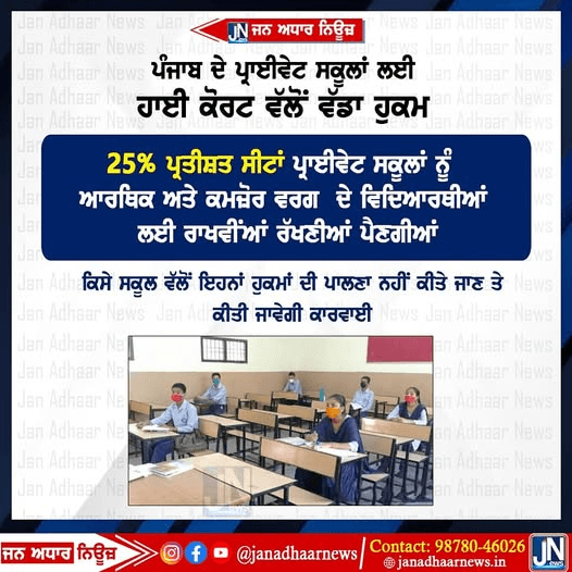 ਪੰਜਾਬ ਦੇ ਪ੍ਰਾਈਵੇਟ ਸਕੂਲਾਂ ਲਈ ਹਾਈਕੋਰਟ ਦਾ ਵੱਡਾ ਹੁਕਮ – 25% ਪ੍ਰਤੀਸ਼ਤ ਸੀਟਾਂ ਪ੍ਰਾਈਵੇਟ ਸਕੂਲਾਂ ਨੂੰ ਆਰਥਿਕ ਅਤੇ ਕਮਜ਼ੋਰ ਵਰਗ ਦੇ ਵਿਦਿਆਰਥੀਆਂ ਲਈ ਰਾਖਵੀਂਆਂ ਰੱਖਣੀਆਂ ਪੈਣਗੀਆਂ।