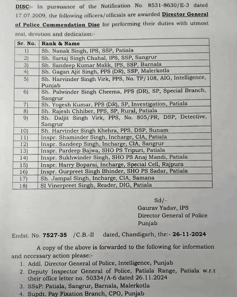 ਪੰਜਾਬ ਦੇ 18 ਪੁਲਿਸ ਅਫਸਰਾਂ ਨੂੰ ਡਾਇਰੈਕਟਰ ਜਨਰਲ ਆਫ ਪੁਲਿਸ ਕੋਮਾਂਡੇਸ਼ਨ ਐਵਾਰਡ ਦਿੱਤਾ ਜਾਵੇਗਾ। ਇਨ੍ਹਾਂ ਪੰਜਾਬ ਪੁਲਿਸ ਮੁਲਾਜ਼ਮਾਂ ਨੂੰ ਆਪਣੀ ਡਿਊਟੀ ਪੂਰੀ ਤਨਦੇਹੀ ਨਾਲ ਨਿਭਾਉਣ ਲਈ ਸਨਮਾਨਿਤ ਕੀਤਾ ਜਾਵੇਗਾ। ਜਿਨ੍ਹਾਂ ਪੁਲਿਸ ਅਫਸਰਾਂ ਨੂੰ ਸਨਮਾਨਿਤ ਕੀਤਾ ਜਾਵੇਗਾ ਉਨ੍ਹਾਂ ਦੀ ਸੂਚੀ ਹੇਠਾਂ ਦਿੱਤੀ ਹੈ