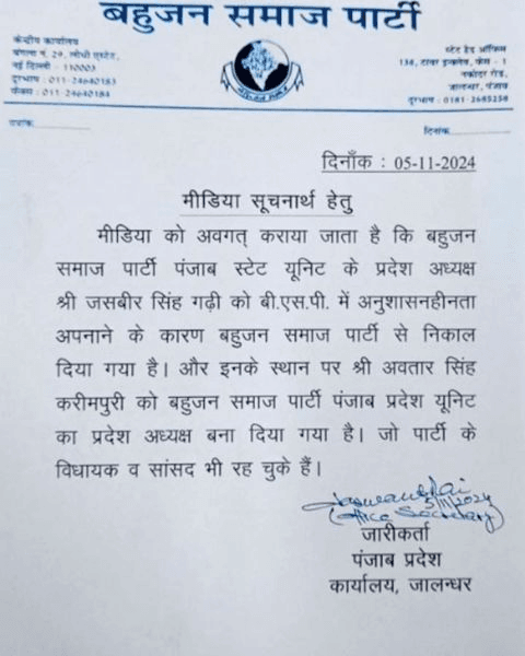 ਬਹੁਜਨ ਸਮਾਜ ਪਾਰਟੀ ਦੀ ਸੁਪਰੀਮੋ ਮਾਇਆਵਤੀ ਨੇ ਜਸਬੀਰ ਸਿੰਘ ਗੜੀ ਨੂੰ ਪਾਰਟੀ ਵਿੱਚੋਂ ਕੱਢਿਆ ਬਾਹਰ, ਅਵਤਾਰ ਸਿੰਘ ਕਰੀਮਪੁਰੀ ਹੋਣਗੇ ਪੰਜਾਬ BSP ਦੇ ਨਵੇਂ ਪ੍ਰਧਾਨ।