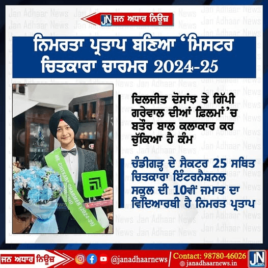 ਚੰਡੀਗੜ੍ਹ ਦੇ ਸੈਕਟਰ 25 ਸਥਿਤ ਚਿਤਕਾਰਾ ਇੰਟਰਨੈਸ਼ਨਲ ਸਕੂਲ ਦੀ 10ਵੀਂ ਜਮਾਤ ਦਾ ਵਿੱਦਿਆਰਥੀ ਨਿਮਰਤ ਪ੍ਰਤਾਪ ਸਿੰਘ ਬਣਿਆ – “ਮਿਸਟਰ ਚਿਤਕਾਰਾ ਚਾਰਮਰ 2024-25