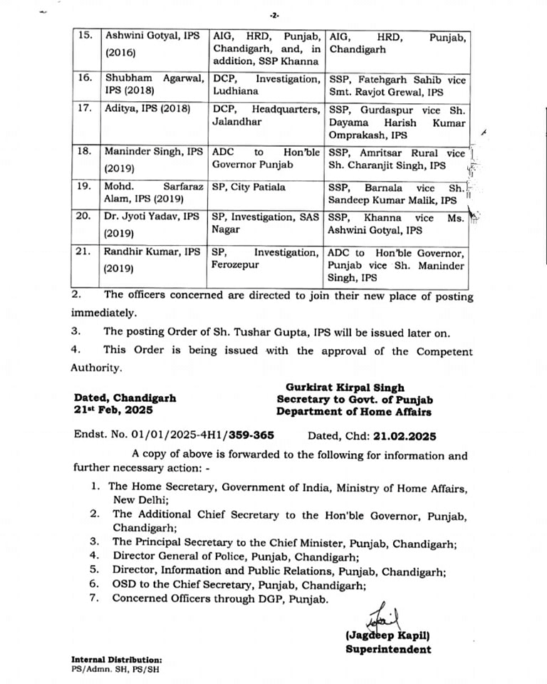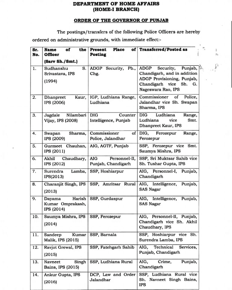 ਮੁੱਖ ਮੰਤਰੀ ਭਗਵੰਤ ਮਾਨ ਸਰਕਾਰ (CM Mann) ਵੱਲੋਂ ਸ਼ੁੱਕਰਵਾਰ ਵੱਡੇ ਪੱਧਰ ‘ਤੇ ਪੰਜਾਬ ਪੁਲਿਸ ਵਿੱਚ ਤਰੱਕੀਆਂ ਤੇ ਤਬਾਦਲੇ ਕੀਤੇ ਗਏ। ਇਨ੍ਹਾਂ ਵਿੱਚ 9 ਜ਼ਿਲ੍ਹਿਆਂ ਦੇ ਐਸਐਸਪੀ ਬਦਲੇ ਗਏ ਹਨ, ਜਦਕਿ ਕੁੱਲ 21 ਅਧਿਕਾਰੀਆਂ ਦਾ ਰੱਦੋ-ਬਦਲ ਕੀਤਾ ਗਿਆ ਹੈ। ਪੜੋ ਪੁਰੀ ਲਿਸਟ…