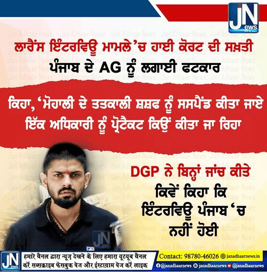 ਲਾਰੈਂਸ ਇੰਟਰਵਿਊ ਮਾਮਲੇ ‘ਚ ਹਾਈ ਕੋਰਟ ਦੀ ਸਖ਼ਤੀ ਪੰਜਾਬ ਦੇ AG ਨੂੰ ਲਗਾਈ ਫਟਕਾਰ | ਕਿਹਾ, ‘ਮੋਹਾਲੀ ਦੇ ਤਤਕਾਲੀ ਸ਼ਸ਼ਫ ਨੂੰ ਸਸਪੈਂਡ ਕੀਤਾ ਜਾਏ ਇੱਕ ਅਧਿਕਾਰੀ ਨੂੰ ਪ੍ਰੋਟੈਕਟ ਕਿਉਂ ਕੀਤਾ ਜਾ ਰਿਹਾ | DGP ਨੇ ਬਿਨ੍ਹਾਂ ਜਾਂਚ ਕੀਤੇ ਕਿਵੇਂ ਕਿਹਾ ਕਿ ਇੰਟਰਵਿਊ ਪੰਜਾਬ ‘ਚ ਨਹੀਂ ਹੋਈ |