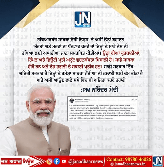 ਹਥਿਆਰਬੰਦ ਸਾਬਕਾ ਫ਼ੌਜੀ ਦਿਵਸ ‘ਤੇ ਅਸੀਂ ਉਨ੍ਹਾਂ ਬਹਾਦਰ ਔਰਤਾਂ ਅਤੇ ਮਰਦਾਂ ਦਾ ਧੰਨਵਾਦ ਕਰਦੇ ਹਾਂ ਜਿਨ੍ਹਾਂ ਨੇ ਸਾਡੇ ਦੇਸ਼ ਦੀ ਰੱਖਿਆ ਲਈ ਆਪਣੀਆਂ ਜਾਨਾਂ ਸਮਰਪਿਤ ਕੀਤੀਆਂ। ਉਨ੍ਹਾਂ ਦੀਆਂ ਕੁਰਬਾਨੀਆਂ, ਹਿੰਮਤ ਅਤੇ ਡਿਊਟੀ ਪ੍ਰਤੀ ਅਟੁੱਟ ਵਚਨਬੱਧਤਾ ਮਿਸਾਲੀ ਹੈ । ਸਾਡੇ ਸਾਬਕਾ ਹੀਰੋ ਹਨ ਅਤੇ ਦੇਸ਼ ਭਗਤੀ ਦੇ ਸਥਾਈ ਪ੍ਰਤੀਕ ਹਨ। ਸਾਡੀ ਸਰਕਾਰ ਇੱਕ ਅਜਿਹੀ ਸਰਕਾਰ ਹੈ ਜਿਨ੍ਹਾਂ ਨੇ ਹਮੇਸ਼ਾ ਸਾਬਕਾ ਫ਼ੌਜੀਆਂ ਦੀ ਭਲਾਈ ਲਈ ਕੰਮ ਕੀਤਾ ਹੈ ਅਤੇ ਅਸੀਂ ਆਉਣ ਵਾਲੇ ਸਮੇਂ ਵਿੱਚ ਵੀ ਅਜਿਹਾ ਕਰਦੇ ਰਹਾਂਗੇ : – PM ਨਰਿੰਦਰ ਮੋਦੀ