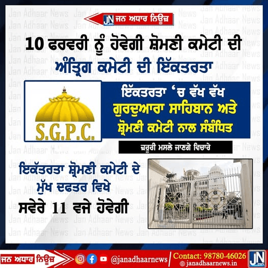 10 ਫਰਵਰੀ ਨੂੰ ਹੋਵੇਗੀ ਸ਼੍ਰੋਮਣੀ ਕਮੇਟੀ ਦੀ ਅੰਤ੍ਰਿੰਗ ਕਮੇਟੀ ਦੀ ਇਕੱਤਰਤਾ।