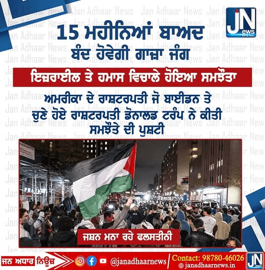 15 ਮਹੀਨਿਆਂ ਬਾਅਦ ਬੰਦ ਹੋਵੇਗੀ ਗਾਜ਼ਾ ਜੰਗਂ | ਇਜ਼ਰਾਈਲ ਤੇ ਹਮਾਸ ਵਿਚਾਲੇ ਹੋਇਆ ਸਮਝੌਤਾ | ਅਮਰੀਕਾ ਦੇ ਰਾਸ਼ਟਰਪਤੀ ਜੋ ਬਾਈਡਨ ਚਣੇ ਹੋਏ ਰਾਸ਼ਟਰਪਤੀ ਡੋਨਾਲਡ ਸਮਝੌਤੇ ਦੀ ਪੁਸ਼ਟੀ।