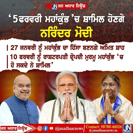 5 ਫਰਵਰੀ ਮਹਾਂਕੁੰਭ ਦੇ ਵਿੱਚ ਸ਼ਾਮਿਲ ਹੋਣਗੇ ਪ੍ਰਧਾਨ ਮੰਤਰੀ ਮੋਦੀ, 27 ਜਨਵਰੀ ਨੂੰ ਅਮਿਤ ਸ਼ਾਹ ਬੰਨਣਗੇ ਮਹਾਂਕੁੰਭ ਦਾ ਹਿੱਸਾ। 10 ਫਰਵਰੀ ਨੂੰ ਰਾਸ਼ਟਰਪਤੀ ਦ੍ਰੋਪਦੀ ਮੁਰਮੂ ਮਹਾਂਕੁੰਭ ‘ਚ ਹੋ ਸਕਦੇ ਨੇ ਸ਼ਾਮਿਲ’।
