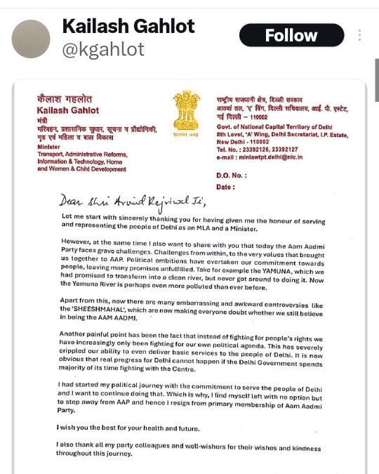 ਆਮ ਆਦਮੀ ਪਾਰਟੀ ਦੀ ਦਿੱਲੀ ਸਰਕਾਰ ਦੇ ਸੀਨੀਅਰ ਮੰਤਰੀ ਕੈਲਾਸ਼ ਗਹਿਲੋਤ (kailash gahlot) ਨੇ ਆਪਣੇ ਅਹੁਦੇ ਤੋਂ ਅਸਤੀਫਾ ਦੇ ਦਿੱਤਾ ਹੈ। ਉਹ ਸਰਕਾਰ ਵਿੱਚ ਟਰਾਂਸਪੋਰਟ ਮੰਤਰੀ ਵਜੋਂ ਕੰਮ ਕਰ ਰਹੇ ਸਨ, ਉਨ੍ਹਾਂ ਨੇ ਆਮ ਆਦਮੀ ਪਾਰਟੀ (aam aadmi party) ਵੀ ਛੱਡ ਦਿੱਤੀ ਹੈ। ਮੰਤਰੀ ਕੈਲਾਸ਼ ਗਹਿਲੋਤ ਨੇ ਵੀ ਸੋਸ਼ਲ ਮੀਡੀਆ ‘ਤੇ ਸ਼ੇਅਰ ਕੀਤੀ ਆਪਣੀ ਚਿੱਠੀ ‘ਚ ਆਮ ਆਦਮੀ ਪਾਰਟੀ ਦੀਆਂ ਅੰਦਰੂਨੀ ਗੱਲਾਂ ਦਾ ਜ਼ਿਕਰ ਕਰਦਿਆਂ ਕਿਹਾ ਕਿ ਸਾਨੂੰ ਇਸ ‘ਤੇ ਕਾਬੂ ਪਾਉਣ ਦੀ ਲੋੜ ਹੈ। ਅਰਵਿੰਦ ਕੇਜਰੀਵਾਲ ਦੇ ਘਰ ਨੂੰ ਲੈ ਕੇ ਹੋਏ ਵਿਵਾਦ ਦਾ ਹਵਾਲਾ ਦਿੰਦੇ ਹੋਏ ਉਨ੍ਹਾਂ ਨੇ ‘ਸ਼ੀਸ਼ਮਹਿਲ’ ਸ਼ਬਦ ਦੀ ਵਰਤੋਂ ਕੀਤੀ।