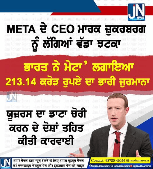META ਦੇ CEO ਮਾਰਕ ਜ਼ੁਕਰਬਰਗ ਨੂੰ ਲੱਗਿਆਂ ਵੱਡਾ ਝਟਕਾ ਭਾਰਤ ਨੇ ਮੇਟਾ’ ਤੇ ਲਗਾਇਆ 213.14 ਕਰੋੜ ਰੁਪਏ ਦਾ ਭਾਰੀ ਜੁਰਮਾਨਾ| ਯੂਜ਼ਰਸ ਦਾ ਡਾਟਾ ਚੋਰੀ ਕਰਨ ਦੇ ਦੋਸ਼ਾਂ ਤਹਿਤ ਕੀਤੀ ਕਾਰਵਾਈ।